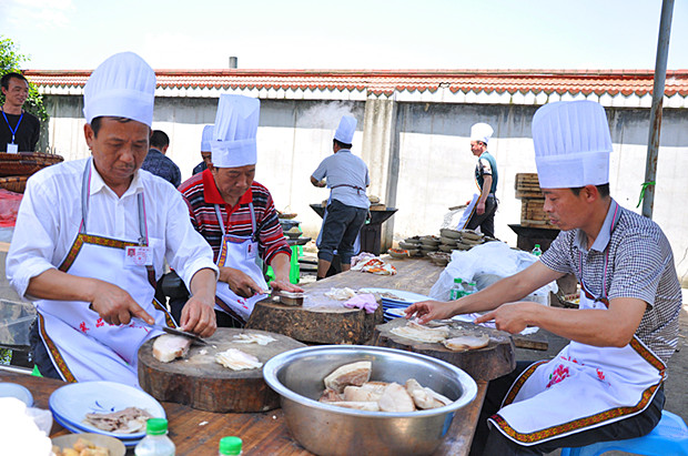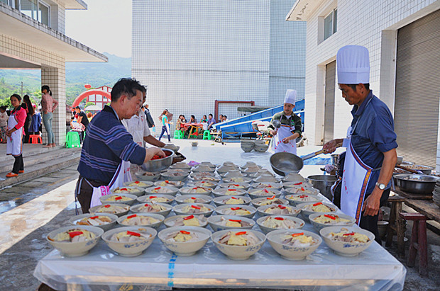 興文大壩古鎮(zhèn)是苗族聚居地,節(jié)日當(dāng)天,遠(yuǎn)近村寨的苗族同胞紛紛聚集到了這里,身著節(jié)日盛裝,跳著歡快的苗家舞蹈。古鎮(zhèn)街巷,沉浸在一片節(jié)日的喜慶氛圍中,好比過年。除了最具傳統(tǒng)特色的高裝巡游外,遠(yuǎn)道而來的游客還有幸品嘗了最具鄉(xiāng)土風(fēng)情的傳統(tǒng)宴席——苗鄉(xiāng)“水八碗”。