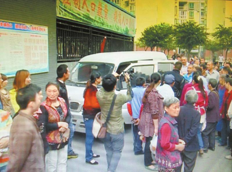 蔡先生(左,身穿紅色襯衫)在人群中等候單位領(lǐng)導(dǎo)前來(lái)說(shuō)明情況。(視頻截圖)