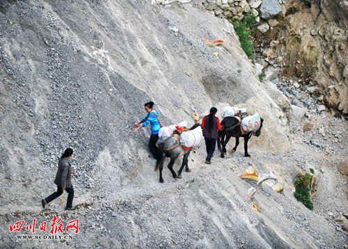 崎嶇的山路不能通車,馬是唯一的交通工具,道路有時窄的只能讓一人通行,馬劍霞爬到山上讓