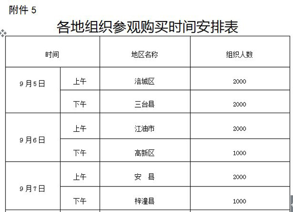 在這張工作方案上,最引人注目的就是“各縣市區(qū)、園區(qū)按照全市統(tǒng)一安排部署,組織本地干部職工、群眾前往會展中心參觀、購買(具體安排見附件5)。市級相關(guān)部門自行安排時間組織干部職工前往參觀購買!痹诟郊5中,綿陽市明確要求每天安排兩個各區(qū)縣組團(tuán)參加展銷會,要求有的區(qū)縣組織1000人,有的區(qū)縣組織2000人,總?cè)藬?shù)為19000人。如果加上綿陽“市級相關(guān)部門自行安排時間組織干部職工前往參觀購買”的人數(shù),僅綿陽市政府組團(tuán)參觀的人數(shù)就超過20000人。