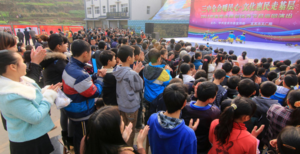 央廣網(wǎng)屏山12月5日消息(曾忠 曹鵬 記者隆敏)由宜賓市委宣傳部、文廣新局主辦的“三中全會(huì)暖民心,文化惠民走基層”2013年宜賓市優(yōu)秀原創(chuàng)節(jié)目巡回演出來(lái)到屏山縣,先后在該縣鴨池鄉(xiāng)文化廣場(chǎng)和縣學(xué)苑街小學(xué)校園演出,數(shù)以千計(jì)的城鄉(xiāng)群眾和學(xué)生觀看演出,共享宜賓市一年來(lái)的文化藝術(shù)成果。