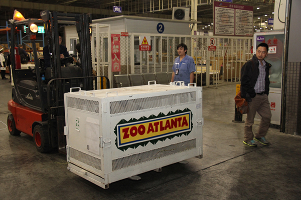 凌晨1:20分左右,大熊貓喜蘭和阿寶乘坐的航班順利降落在成都雙流國際機場。早已等候多時的工作人員,用叉車將這兩只回國的寶貝轉(zhuǎn)運到專門的運輸車輛上。第一次踏上故土的喜蘭和阿寶,好奇的不住四處張望。也許由于長途跋涉回來,這對海歸兄弟也微微流露出一絲絲倦意,不一會就安靜的趴在鐵籠里。