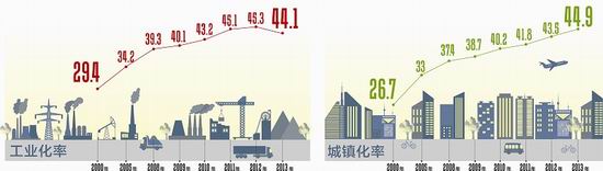 從瀘州到南充,從川南到川北,從安寧河谷到成都平原,在“兩化”互動(dòng)、城鄉(xiāng)統(tǒng)籌發(fā)展戰(zhàn)略的指引下,全省城鎮(zhèn)與工業(yè)發(fā)展不協(xié)調(diào)的局面正在被改變,兩率間的差距開(kāi)始逐步縮小。2012年,縮小為1.8個(gè)百分點(diǎn),2013年,城鎮(zhèn)化率首次超越工業(yè)化率,從落后1.8個(gè)百分點(diǎn)到領(lǐng)先0.8個(gè)百分點(diǎn),是過(guò)去10年來(lái)變化最大的一年。