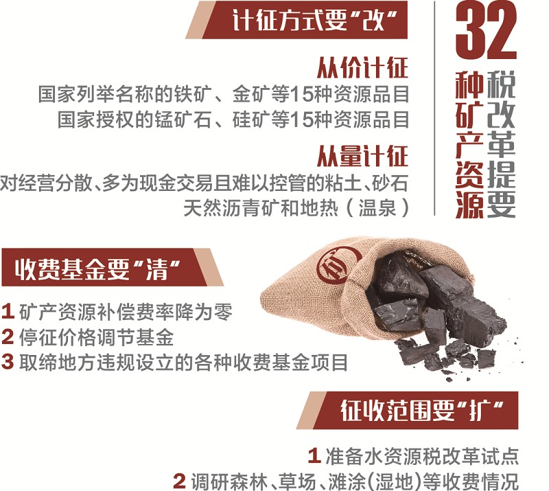 對(duì)于計(jì)征方式要“改”。按通知要求,對(duì)國家列舉名稱的鐵礦、金礦等15種資源品目實(shí)行從價(jià)計(jì)征;對(duì)經(jīng)營分散、多為現(xiàn)金交易且難以控管的粘土、砂石,仍實(shí)行從量計(jì)征。按照國家授權(quán),對(duì)錳礦石、硅礦等15種資源品目征收資源稅。其中,除天然瀝青礦和地?zé)?溫泉)實(shí)行從量計(jì)征外,其余品目一律實(shí)行從價(jià)計(jì)征。