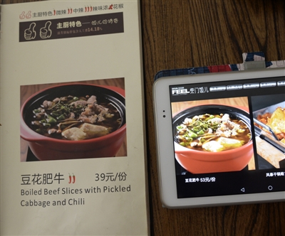 通過比對(duì),執(zhí)法人員發(fā)現(xiàn):兩份菜單在菜品圖片、選料說明上完全相同,而部分相同菜品的價(jià)格卻不一樣。例如:一份陳香櫻桃肉,IPAD上收費(fèi)59元一份,紙質(zhì)菜單上標(biāo)注是39元一份,還有一道“土豪冒菜”,則有三種價(jià)格:紙質(zhì)菜單上標(biāo)注小份39元、大份59元,IPAD上則是一份69元,“很多數(shù)菜品的價(jià)格都不一樣的,兩份菜單對(duì)不上!