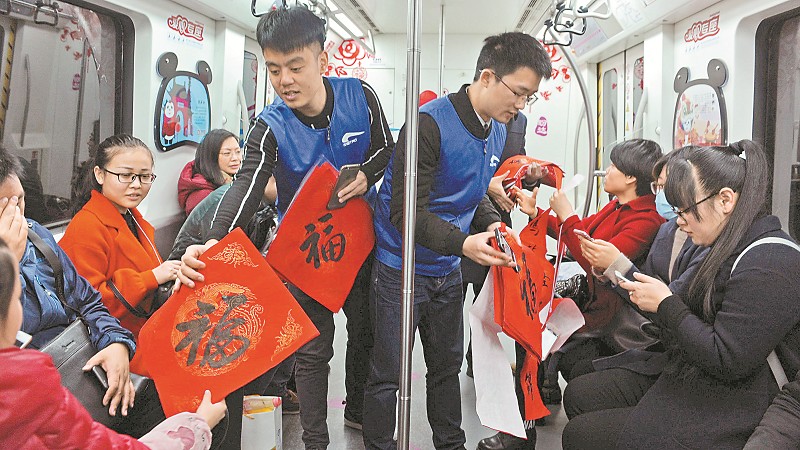 春節(jié)將至,成都地鐵3號線“盼達”號熊貓主題列車換上了“新衣裳”。1月24日,工作人員特意為乘客送上一份由地鐵職工書寫的新春對聯(lián)和大紅“!弊。