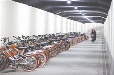 隧道內(nèi)停放了許多共享單車,因隧道無信號(hào)無法使用