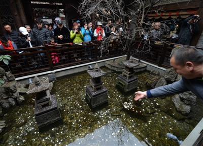 記者駐足停留短短十分鐘內(nèi),就有7名游客扔硬幣“祈!。一個(gè)七八歲的小男孩,在父母的陪同下,連續(xù)向池中扔了3枚1元硬幣!巴筮吥莻(gè)塔上投,看你能不能成功!”男孩的父親鼓勵(lì)道。記者詢問他們?nèi)佑矌诺脑,男孩母親周女士笑道:“新年新歲,帶兒子討個(gè)好彩頭嘛,希望新的一年順順利利。”她還告訴記者,看到滿水池的硬幣,自然就把其認(rèn)作了景區(qū)的許愿池。