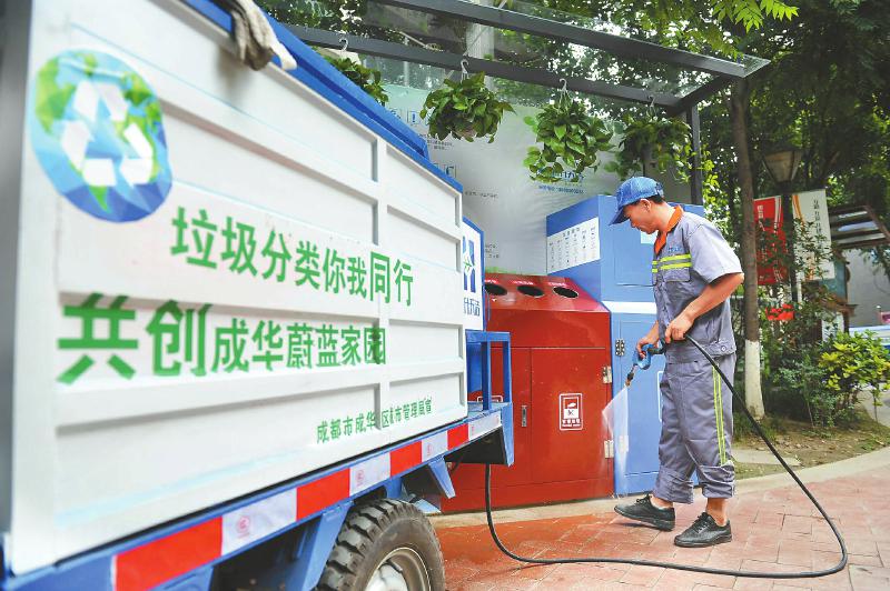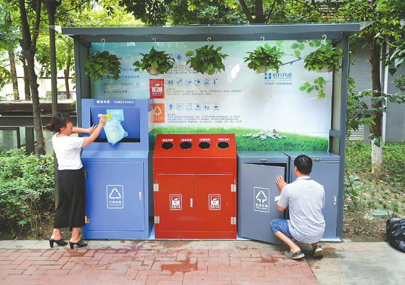 8月1日,成都市成華區(qū)府青路街道一居民小區(qū),居民正在往專(zhuān)設(shè)的分類(lèi)垃圾箱內(nèi)扔垃圾。