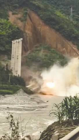 第7秒時(shí),最右邊的兩根橋墩已經(jīng)完全倒在河中,激起巨大水花。在漫天水花和塵土中,中間兩根橋墩也倒向河中,激起至少10米以上的水花。