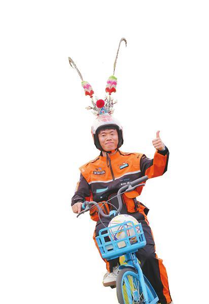 淘寶閃購騎手趙明陽頭戴“美猴王翎子”參賽。