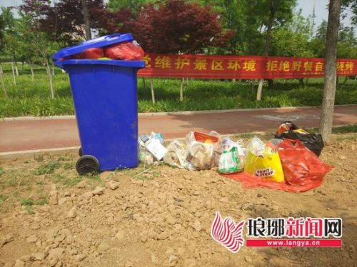 在濱河景區(qū)暢園內(nèi),沂蒙晚報(bào)記者看到隨處懸掛著“自覺維護(hù)景區(qū)環(huán)境,拒絕野餐自助燒烤”的紅色條幅。在路邊一處垃圾桶旁,沂蒙晚報(bào)記者看到,藍(lán)色的垃圾桶里已經(jīng)裝滿了垃圾,垃圾桶的蓋子都蓋不上了,垃圾桶旁邊是一袋袋的垃圾。