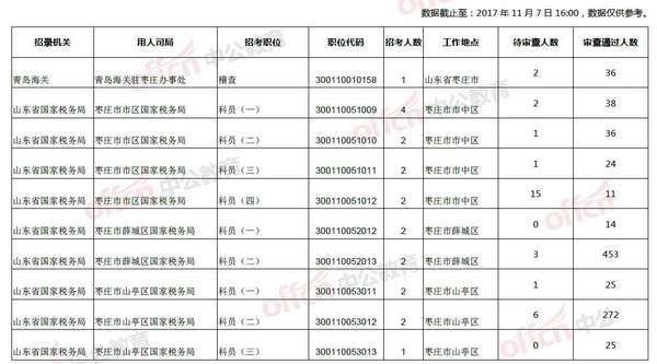大眾網(wǎng)棗莊11月8日訊 按照公布的招考公告,為期10天的2018年度國考報(bào)名將在今日18時(shí)截止,報(bào)名資格審查將持續(xù)至10日18時(shí)。涉棗崗位報(bào)名情況冷熱不均,最熱崗位報(bào)名人數(shù)達(dá)456人,最冷門崗位則僅4人報(bào)名。