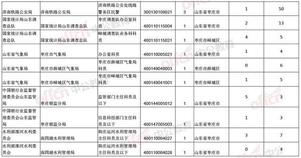 報(bào)名人數(shù)最少的是棗莊銀監(jiān)分局信息科技部門主任科員及以下崗和南四湖水利管理局韓莊運(yùn)河水利管理局主任科員及以下崗(法學(xué)專業(yè)),報(bào)考人數(shù)均為4人。