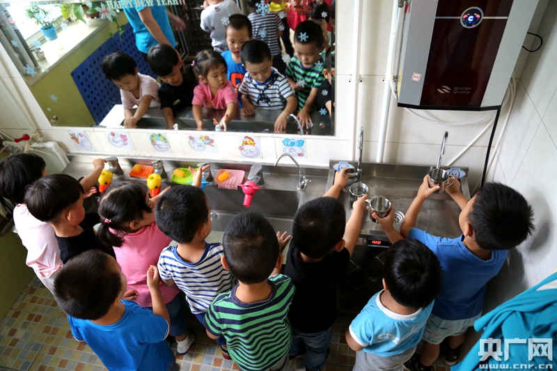 雖然已經(jīng)過了白露節(jié)氣,不過今天濟(jì)南的溫度依然很高,孩子們的水分就要有所保障。在進(jìn)行了一定的活動(dòng)之后老師就要組織孩子喝水和上廁所,本來就不大的洗手間被孩子們擠滿,老師要時(shí)刻盯著孩子們,以免發(fā)生意外。