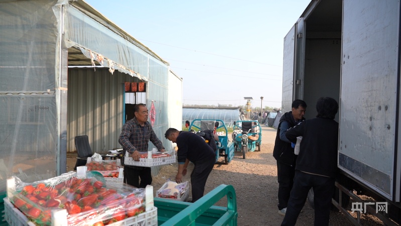 一大早,“齊魯天路”安丘段沿線草莓大棚外,果農(nóng)們正忙碌著將一筐筐鮮紅的草莓裝車。(央廣網(wǎng)發(fā) 范坤 攝)
