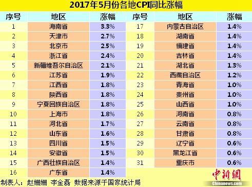 數(shù)據(jù)顯示,海南5月份CPI同比漲幅為3.3%,漲幅全國最高,也是5月份全國僅有的CPI漲幅進入“3時代”的地區(qū)。