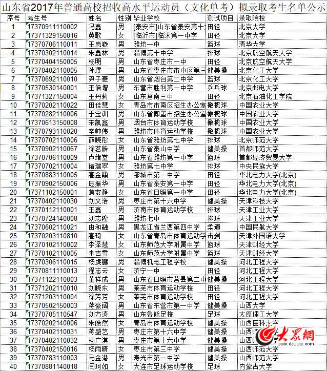 大眾網(wǎng)濟(jì)南6月28日訊 記者從山東省教育招生考試院獲悉,山東省2017年普通高校招收高水平運(yùn)動(dòng)員(文化單考)擬錄取考生名單日前已公示,共143人,具體如下:
