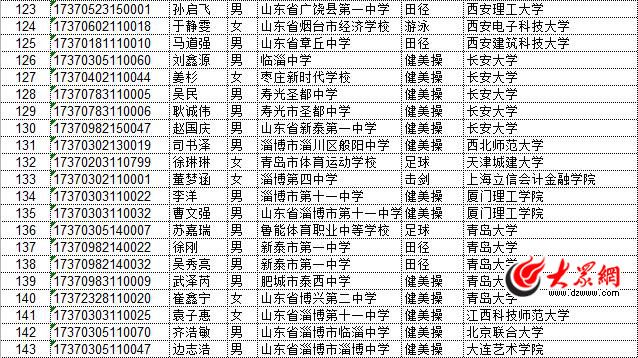 記者從山東省教育招生考試院獲悉,山東省2017年普通高校招收高水平運(yùn)動(dòng)員(文化單考)擬錄取考生名單日前已公示,共143人。