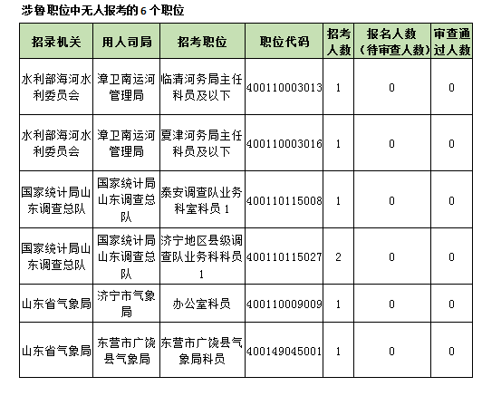 涉魯職位仍有6席無(wú)人報(bào)考,分別類屬于水利部海河水利委員會(huì)、國(guó)家統(tǒng)計(jì)局山東調(diào)查總隊(duì)和山東省氣象局!氨恪甭毼粸榕R清河務(wù)局主任科員及以下、夏津河務(wù)局主任科員及以下、泰安調(diào)查隊(duì)業(yè)務(wù)科室科員1、濟(jì)寧地區(qū)縣級(jí)調(diào)查隊(duì)業(yè)務(wù)科科員1、濟(jì)寧市氣象局辦公室科員、東營(yíng)市廣饒縣氣象局科員。