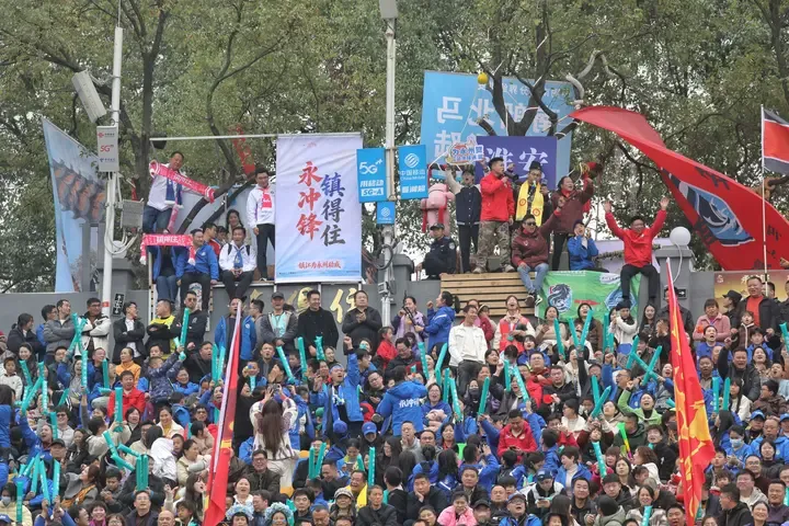 “現(xiàn)在這里是全永州最熱鬧的地方,甚至是全國最熱鬧的地方,我過年都看不到這么多人滴。”帶著婉轉(zhuǎn)的湘音,永州當?shù)厥忻駨垊P話語中透露著自豪。跟隨著人流前進,爆火出圈的“掛票樹”出現(xiàn)在眼前。在今年1月12日,永州通過公證抽簽的方式,將15棵掛票樹中的14棵贈予江蘇十三太保及湖北黃石,僅留1棵作為自家“十五弟”。江蘇球迷迅速出動,“十三太!本砥鹧b修,把自家最亮眼的特色裝飾到掛票樹上,“掛票樹”跨省認領(lǐng),完成了一場城市文化秀。在“掛票樹”前,不管是當?shù)厥忻襁是外來游客,紛紛拍照打卡,大家爭相登上“掛票樹”,感受下掛票看球的別樣韻味。不僅“掛票”爆火,“磚票”也成為了新的一景。站在磚頭搭起的臨時區(qū)域,不少永州崽為自己家鄉(xiāng)助威,“永州,曉了顯火(意思非常厲害)”,稚嫩的童聲中傳遞出的家鄉(xiāng)話,清亮又軟糯。