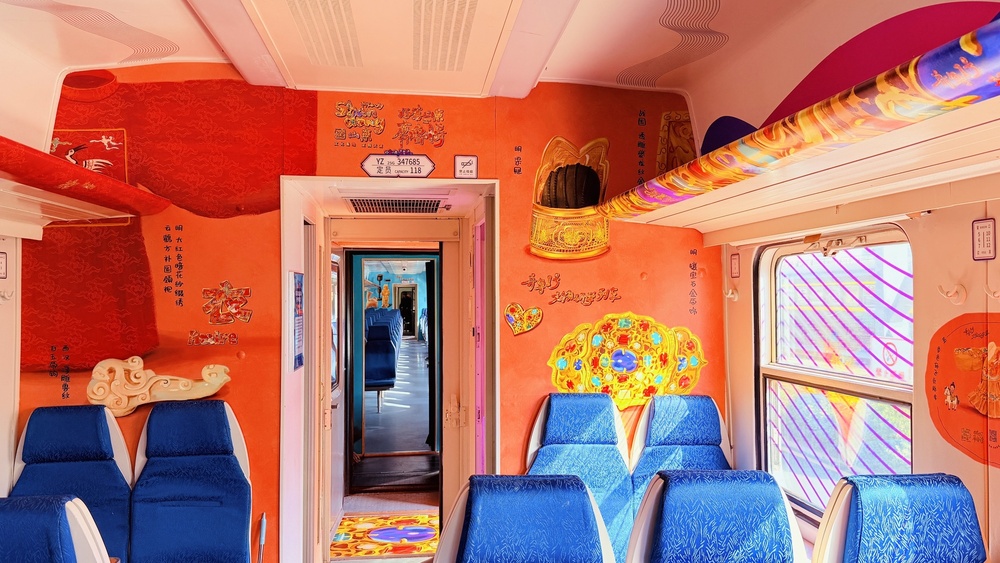 走進(jìn)列車車廂,仿佛穿越回三千年前的齊魯大地。列車設(shè)有青銅、玉器、陶瓷等七節(jié)主題車廂,從戰(zhàn)國(guó)時(shí)期的青銅器到精美古代服飾紋樣,每一節(jié)車廂都宛如一座 “微縮博物館”,讓旅客在乘車途中沉浸式感受歷史文化魅力。