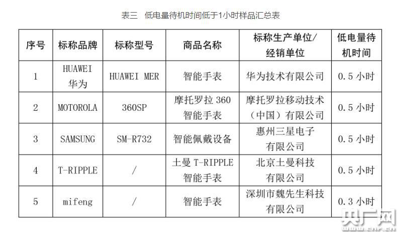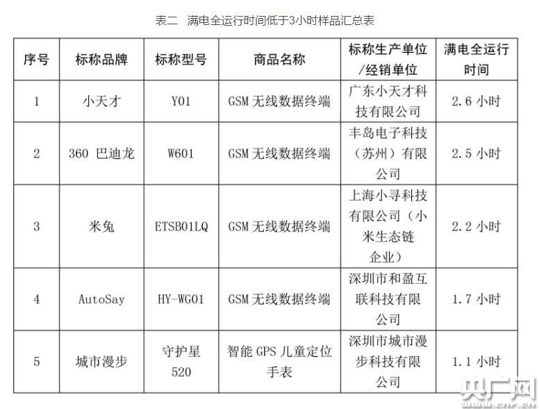 測(cè)試結(jié)果顯示,20塊樣品的滿(mǎn)電全運(yùn)行時(shí)間均不超過(guò)10小時(shí),最長(zhǎng)的為9.2小時(shí),最短的為1.1小時(shí)。其中僅2塊樣品達(dá)到8小時(shí)以上,5塊樣品低于3小時(shí)且都為兒童智能手表(詳見(jiàn)表二)。