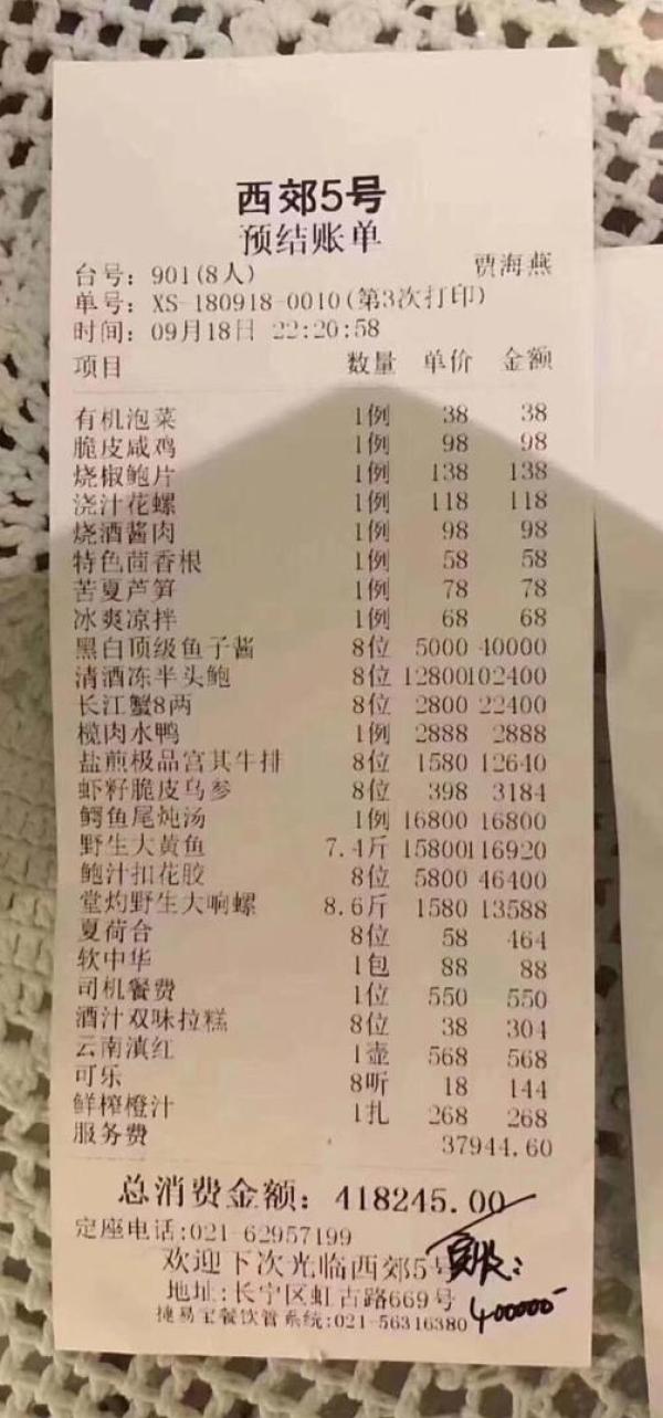 9月19日,一份“天價賬單”在網(wǎng)上引發(fā)關(guān)注。網(wǎng)傳“天價賬單”照片顯示,其出自一家名為“西郊5號”的飯店,位于上海虹古路669號,就餐時間為9月18晚,8人點(diǎn)了20道菜,最后算上服務(wù)費(fèi),共花費(fèi)418245元,實(shí)付40萬元。
