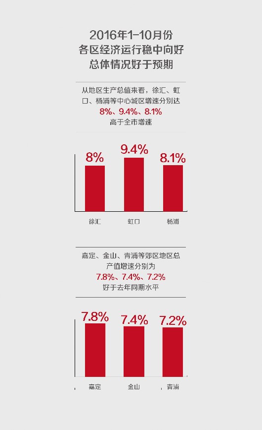 從地區(qū)生產(chǎn)總值來看,徐匯、虹口、楊浦等中心城區(qū)增速分別達8%、9.4%、8.1%,高于全市增速;嘉定、金山、青浦等郊區(qū)地區(qū)總產(chǎn)值增速分別為7.8%、7.4%、7.2%,好于去年同期水平。