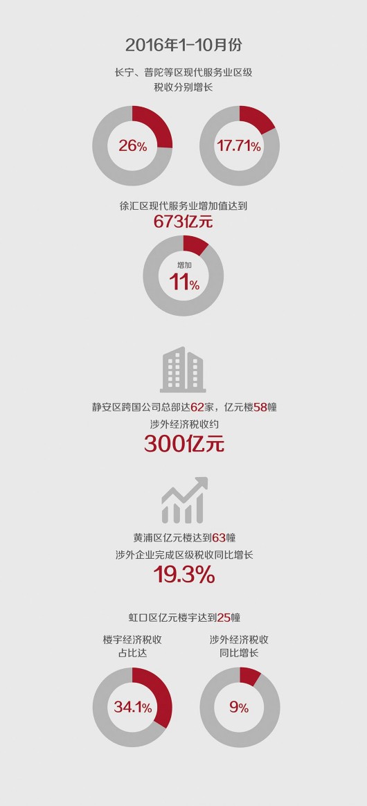去年1-10月,長寧、普陀等區(qū)現(xiàn)代服務(wù)業(yè)區(qū)級稅收分別增長26%、17.71%;徐匯區(qū)現(xiàn)代服務(wù)業(yè)增加值達到673億元,增加11%。靜安區(qū)跨國公司總部達62家,億元樓58幢,涉外經(jīng)濟稅收約300億元;黃浦區(qū)億元樓達到63幢,涉外企業(yè)完成區(qū)級稅收同比增長19.3%;虹口區(qū)億元樓宇達到25幢,樓宇經(jīng)濟稅收占比達34.1%,涉外經(jīng)濟稅收同比增長9%。