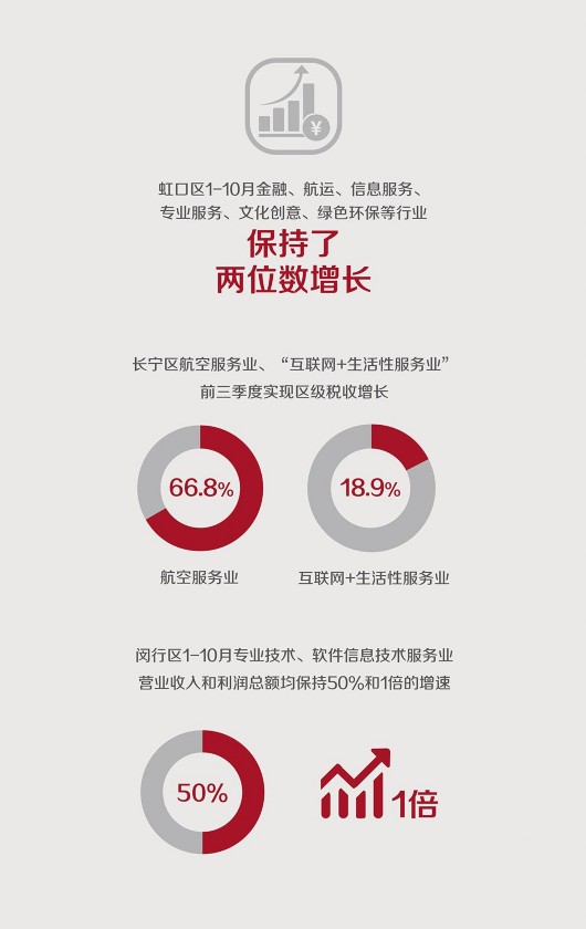 新興服務(wù)業(yè)發(fā)展加速。去年,虹口區(qū)1-10月金融、航運、信息服務(wù)、專業(yè)服務(wù)、文化創(chuàng)意、綠色環(huán)保等行業(yè)保持了兩位數(shù)增長;長寧區(qū)航空服務(wù)業(yè)、“互聯(lián)網(wǎng)+生活性服務(wù)業(yè)”前三季度實現(xiàn)區(qū)級稅收增長66.8%和18.9%;閔行區(qū)1-10月專業(yè)技術(shù)、軟件信息技術(shù)服務(wù)業(yè)營業(yè)收入和利潤總額均保持50%和1倍的增速。