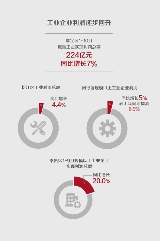 工業(yè)企業(yè)利潤逐步回升。嘉定區(qū)1-10月屬地工業(yè)實現(xiàn)利潤總額224億元,同比增長7%;松江區(qū)工業(yè)利潤總額同比增長4.4%;閔行區(qū)規(guī)模以上工業(yè)企業(yè)利潤同比增長5%,較上年同期提高6.5個百分點;奉賢區(qū)1-9月規(guī)模以上工業(yè)企業(yè)實現(xiàn)利潤總額同比增長20.0%。