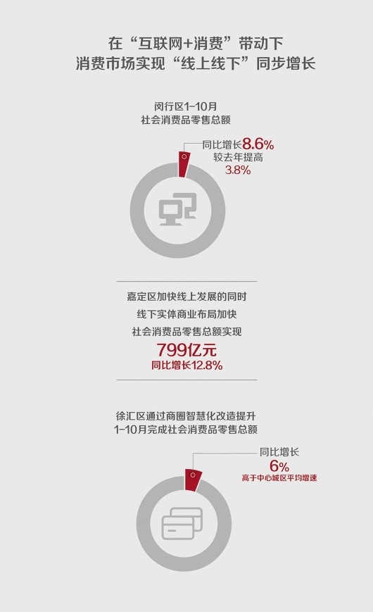 在“互聯(lián)網(wǎng)+消費”帶動下,消費市場實現(xiàn)“線上線下”同步增長。閔行區(qū)1-10月社會消費品零售總額同比增長8.6%,較去年提高3.8個百分點,日用家電在蘇寧云商的帶動下零售額增長近2倍;嘉定區(qū)加快線上發(fā)展的同時,線下實體商業(yè)布局加快,社會消費品零售總額實現(xiàn)799億元,同比增長12.8%,“嘉境通”實現(xiàn)跨境電子商務(wù)交易額9878.9萬元;徐匯區(qū)通過商圈智慧化改造提升,1-10月完成社會消費品零售總額同比增長6%,高于中心城區(qū)平均增速。