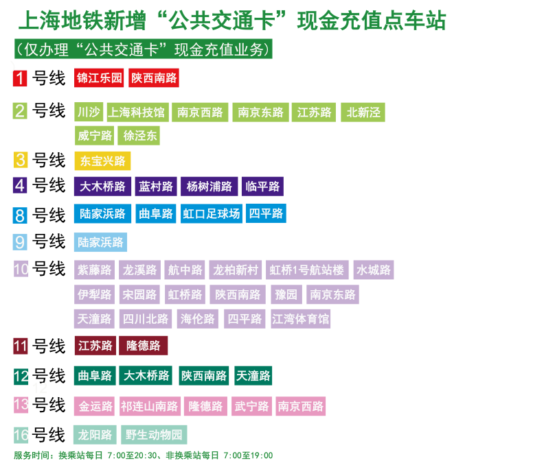 1、新增的50個(gè)交通卡現(xiàn)金人工充值點(diǎn)服務(wù)時(shí)間:換乘站每日7:00至20:30,非換乘站每日7:00至19:00,僅提供公共交通卡現(xiàn)金人工充值服務(wù),不辦理該卡其他業(yè)務(wù)。