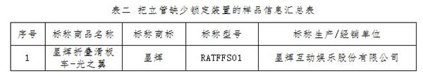 另有1件樣品把立管缺少鎖定裝置,5件樣品把立管強(qiáng)度不達(dá)標(biāo)。把立管作為兒童直接控制滑板車(chē)的部件,除了可調(diào)節(jié)高度、控制方向外,還承受著兒童部分體重,在特殊情況下還會(huì)承受更大的沖擊力或壓力。為避免意外坍塌,把立管應(yīng)當(dāng)有足夠的穩(wěn)定性和強(qiáng)度。標(biāo)準(zhǔn)要求,可調(diào)節(jié)高度的把立管如果不需要額外的工具調(diào)節(jié)高度,則至少要有兩個(gè)鎖定裝置,以防止高度的突然變化。測(cè)試中發(fā)現(xiàn),有1件樣品僅有一個(gè)自動(dòng)鎖定裝置(見(jiàn)表二),沒(méi)有雙重鎖定。