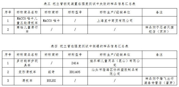 同時(shí)標(biāo)準(zhǔn)還要求,兒童滑板車(chē)不論其適用年齡大小、最大承重多少,把立管都要經(jīng)受垂直方向100kg持續(xù)5分鐘的強(qiáng)度測(cè)試,在測(cè)試中把立管不能倒塌、斷裂,鎖定裝置不能損壞或失效。結(jié)果顯示,有2件樣品的把立管鎖定裝置在強(qiáng)度測(cè)試中失效導(dǎo)致把立管向下塌縮(見(jiàn)表三),3件樣品的把立管在強(qiáng)度測(cè)試中彎折倒塌(見(jiàn)表四)。