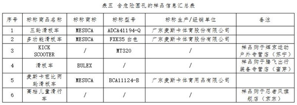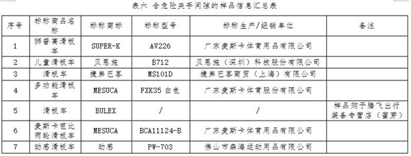 此外,有6件樣品含危險(xiǎn)圓孔,7件樣品含危險(xiǎn)夾手間隙。目前多數(shù)兒童滑板車(chē)都是可調(diào)節(jié)高度的,主要依靠把立管上的多個(gè)圓形定位孔來(lái)調(diào)節(jié)高度。如果把立管的壁很薄而且其上圓孔與兒童手指粗細(xì)差不多,則可能存在兒童手指伸入孔內(nèi)后被卡住的風(fēng)險(xiǎn)。標(biāo)準(zhǔn)要求,兒童滑板車(chē)在任何厚度小于1.58mm的剛性材料上,深度不小于10mm的可觸及圓孔的直徑不應(yīng)在6-12mm之間。測(cè)試結(jié)果顯示,有6件樣品含有尺寸危險(xiǎn)的圓孔(見(jiàn)表五),即在管壁厚度小于1.58mm處存在直徑在6-12mm之間且深度超過(guò)10mm的圓孔。