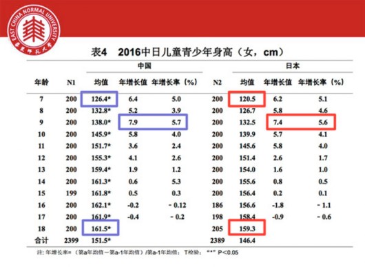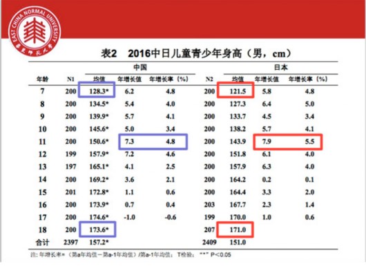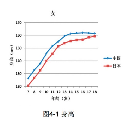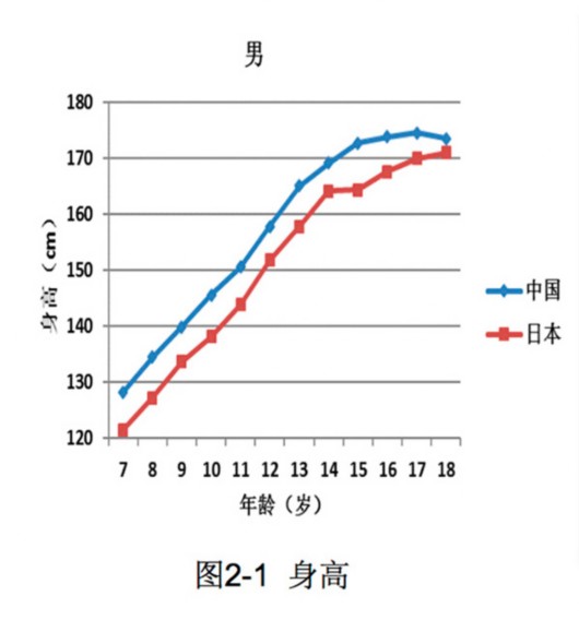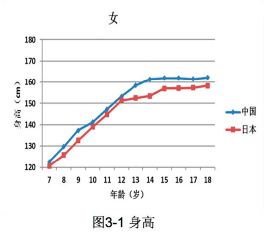 譬如,7-18歲中日兒童青少年(男)身高統(tǒng)計(jì)中,除12歲外,中國男生均顯著高于日本男生。中國女生各年齡段也均顯著高于日本女生。