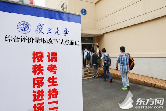 圖片說明:參加復(fù)旦大學(xué)綜合評價錄取改革試點校測面試的考生們正在有序進場。慕梁攝