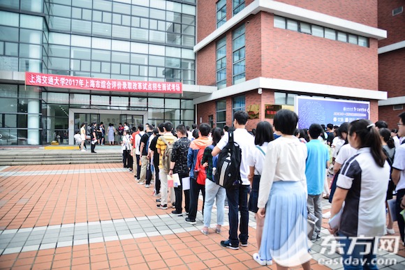 圖片說明:參加上海交通大學(xué)2017年綜合評價錄取改革試點校測面試的考生們,正在考場外列隊有序等待進入。魏楨琦攝