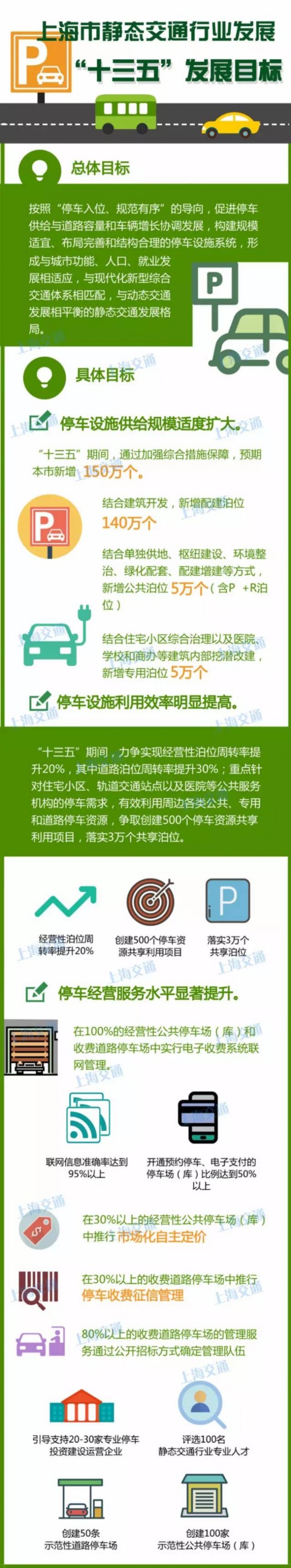 據(jù)上海發(fā)布,市交通委發(fā)布《上海市靜態(tài)交通行業(yè)發(fā)展“十三五”規(guī)劃》:①“十三五”期間預(yù)期本市將新增150萬個(gè)泊位;②力爭(zhēng)實(shí)現(xiàn)經(jīng)營(yíng)性泊位周轉(zhuǎn)率提升20%,其中道路泊位周轉(zhuǎn)率提升30%;③提升經(jīng)營(yíng)性公共停車場(chǎng)(庫(kù))經(jīng)營(yíng)服務(wù)水平;④利用既有的公共、道路、專用等各類停車資源向周邊住宅小區(qū)、醫(yī)院、學(xué)校等錯(cuò)時(shí)開放共享,同步促進(jìn)充電設(shè)施分時(shí)共享;⑤開展公共停車場(chǎng)(庫(kù))收費(fèi)管理區(qū)域試點(diǎn),修訂完善本市公共停車收費(fèi)管理規(guī)定;⑥進(jìn)一步加大停車綜合治理力度?聪挛膅et規(guī)劃要點(diǎn)吧