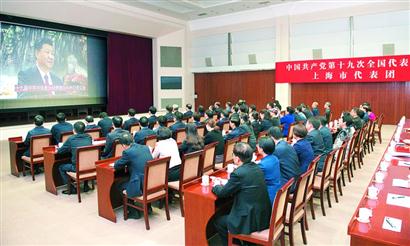 昨天,新一屆中共中央政治局常委在人民大會(huì)堂同中外記者親切見面。出席中國(guó)共產(chǎn)黨第十九次全國(guó)代表大會(huì)的上海市代表團(tuán)在駐地集體收看了見面會(huì)電視直播,聆聽習(xí)近平總書記的重要講話。(記者張馳 攝)
