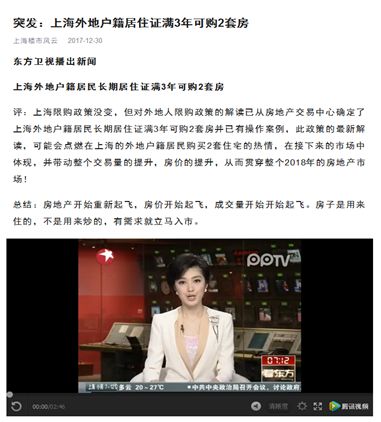 2017年12月30日,上海網(wǎng)警在公開巡查執(zhí)法中發(fā)現(xiàn),微信公眾號(hào)“上海樓市風(fēng)云”發(fā)布了題為《突發(fā):上海外地戶籍居住證滿3年可購2套房》的文章,文中杜撰“東方衛(wèi)視播出新聞,上海外地戶籍居民長期居住證滿3年可購2套房”、“此政策的最新解讀,可能會(huì)點(diǎn)燃在上海的外地戶籍居民購買2套住宅的熱情,在接下來的市場中體現(xiàn),并帶動(dòng)整個(gè)交易量的提升,房價(jià)的提升,從而貫穿整個(gè)2018年的房地產(chǎn)市場”等內(nèi)容,并添加了新聞視頻片段,以提高其可信度。
