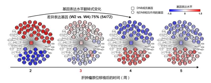 圖片說明:從網(wǎng)絡(luò)層次展示了關(guān)鍵基因CALML3及其相互作用基因的表達水平在肝癌肺轉(zhuǎn)移發(fā)生過程中的動態(tài)變化。紅色和藍色分別代表基因表達水平高和低,可以清楚地看到第三周(即臨界階段)的前后表達水平呈現(xiàn)翻轉(zhuǎn)式變化。