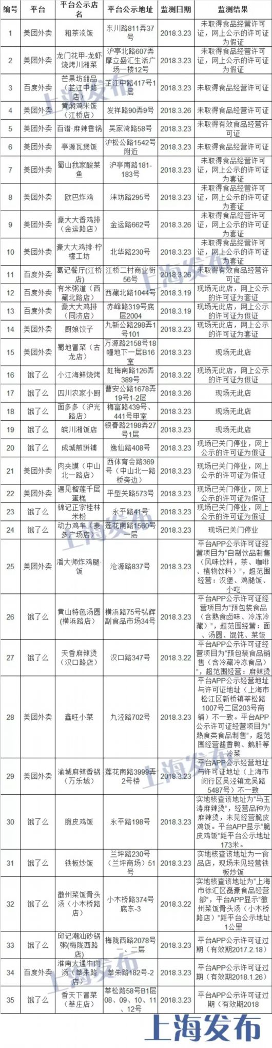 市食藥監(jiān)局今天發(fā)布最新一輪網(wǎng)絡餐飲服務監(jiān)測情況:美團外賣平臺的豪大大香雞排(金運路店)、餓了么平臺的動力雞車(麥多廣場店)、百度外賣平臺的有米粥道(西藏北路店)等35家店鋪存在未取得食品經(jīng)營許可證、網(wǎng)上公示的許可證為假證等問題。市食藥監(jiān)局已責令相關(guān)店鋪立即整改,并依法查處。