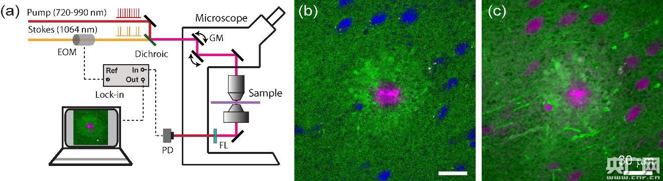 圖(a)受激拉曼顯鏡示意圖。(b)酰胺I譜區(qū)測得的淀粉樣斑塊及腦組織圖像。藍(lán)色:普通蛋白;綠色:脂質(zhì);紫色:淀粉樣蛋白。(c)對應(yīng)的CH譜區(qū)圖像,只能區(qū)分總蛋白(紫色)和脂質(zhì)(綠色)。(央廣網(wǎng)發(fā) 復(fù)旦大學(xué)提供)