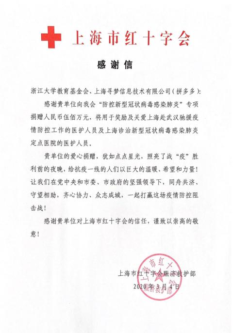 3月4日,上海市紅十字會給拼多多和浙江大學發(fā)來感謝信,感謝兩家單位為醫(yī)護工作人員帶來的500萬元專項捐贈。
