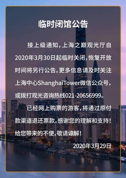 為進(jìn)一步加強(qiáng)對新冠肺炎疫情防控工作的需要,保障游客的健康與安全,明天起(3月30日),東方明珠、金茂大廈、上海中心三大高樓觀光廳臨時關(guān)閉,恢復(fù)開放時間將另行通知。