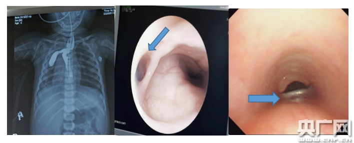 左圖為外院治療前消化道造影,中圖為胃鏡發(fā)現(xiàn)的食道瘺口,右圖為纖支鏡探查可疑氣道瘺口(央廣網(wǎng)發(fā) 復旦兒科供圖)