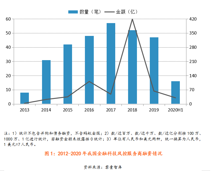 據報告數據顯示,2013-2019年間我國金融科技風控廠商融資事件數整體呈逐年上升的趨勢,2017年達到峰值,融資事件為57起;但從2018年開始,連續(xù)兩年出現下滑趨勢,2019年融資事件數為47起。融資金額整體呈現增長趨勢,2018年披露事件的融資總額最高,為418.6億元,2019年融資金額為63.5億元。